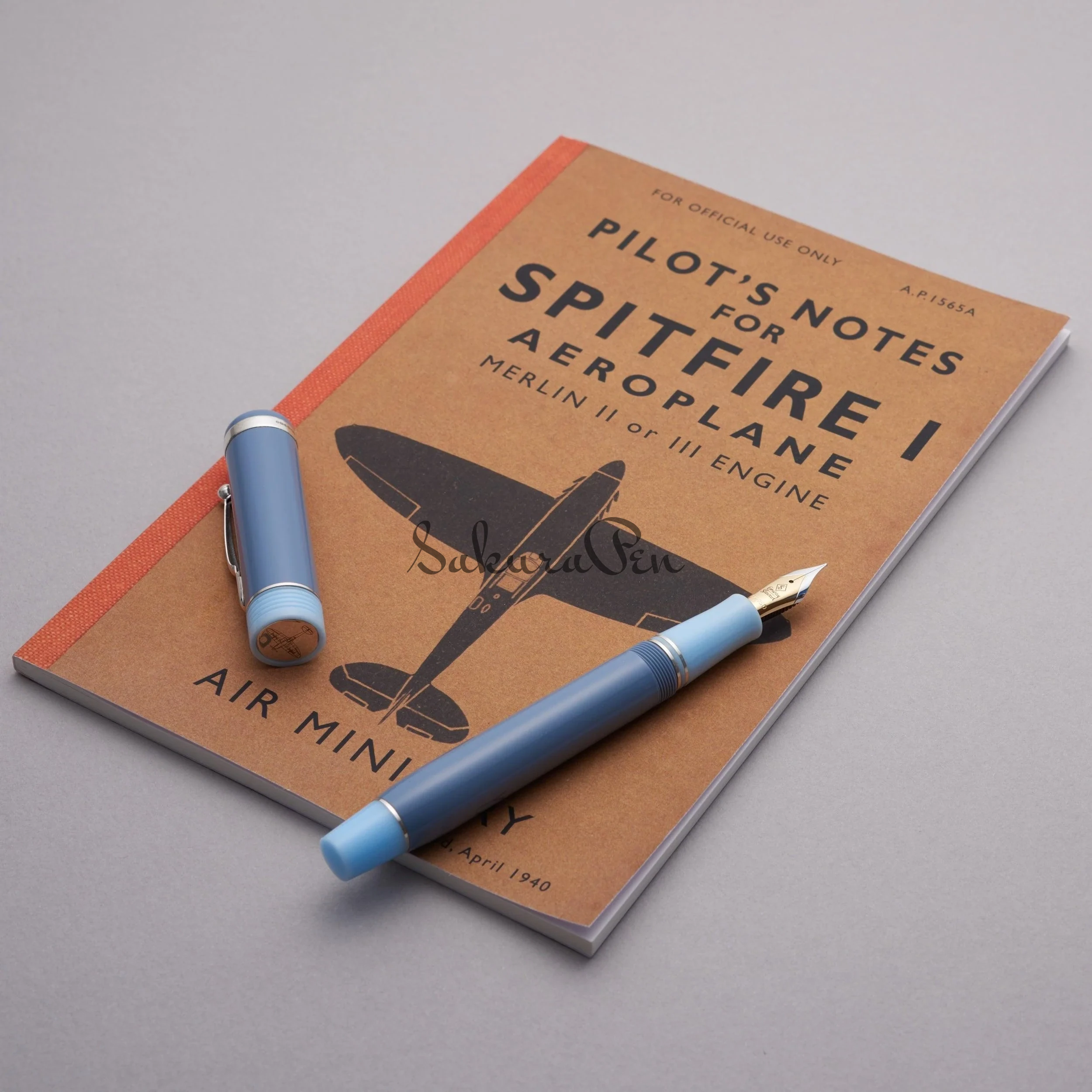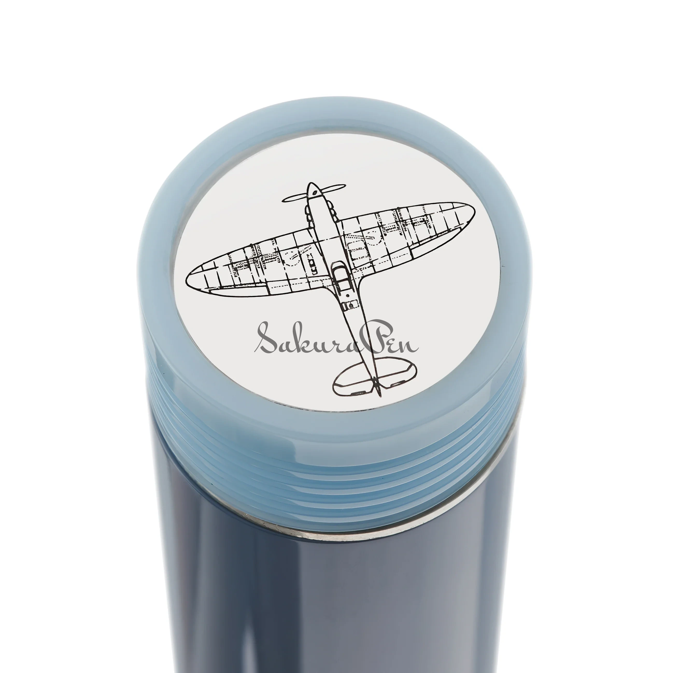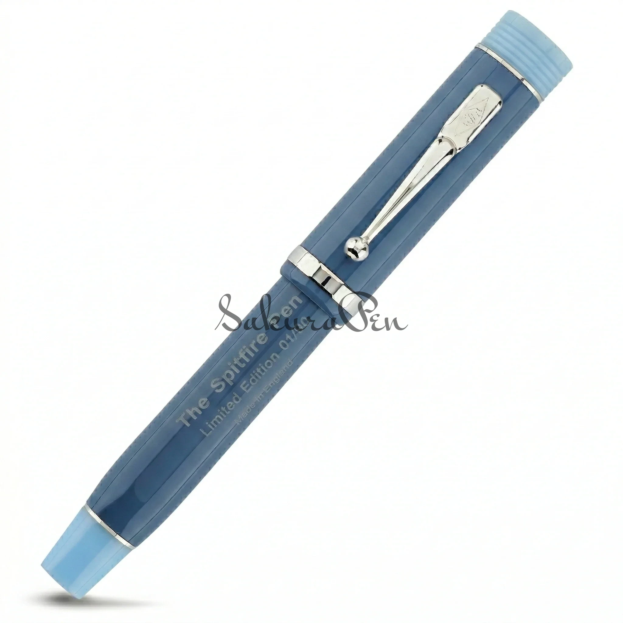 Pióro wykonane jest w kolorze Spitfire Blue z okuciami ze srebra sterlingowego, obramowane jasnoniebieskim tassie i końcem korpusu, co nadaje klasyczny klimat Conway Stewart. Srebrny guzik osadzony na szczycie nasadki nosi wyraźny rysunek Spitfire'a w locie. Szeroka obrączka ze srebra sterlingowego jest stemplowana brytyjskimi znakami certyfikowanymi, potwierdzającymi jej jakość i autentyczność, a do każdego pióra dołączona jest ulotka wyjaśniająca historię brytyjskich znaków towarzyskich.