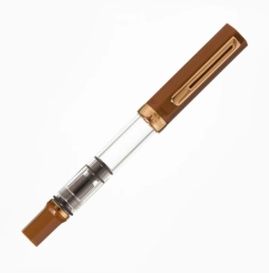 Pióro wieczne TWSBI Eco w kolorze espresso i pokrętło tłoka są uzupełnione brązowymi metalowymi detalami.